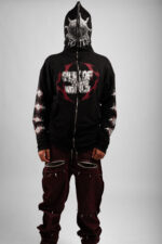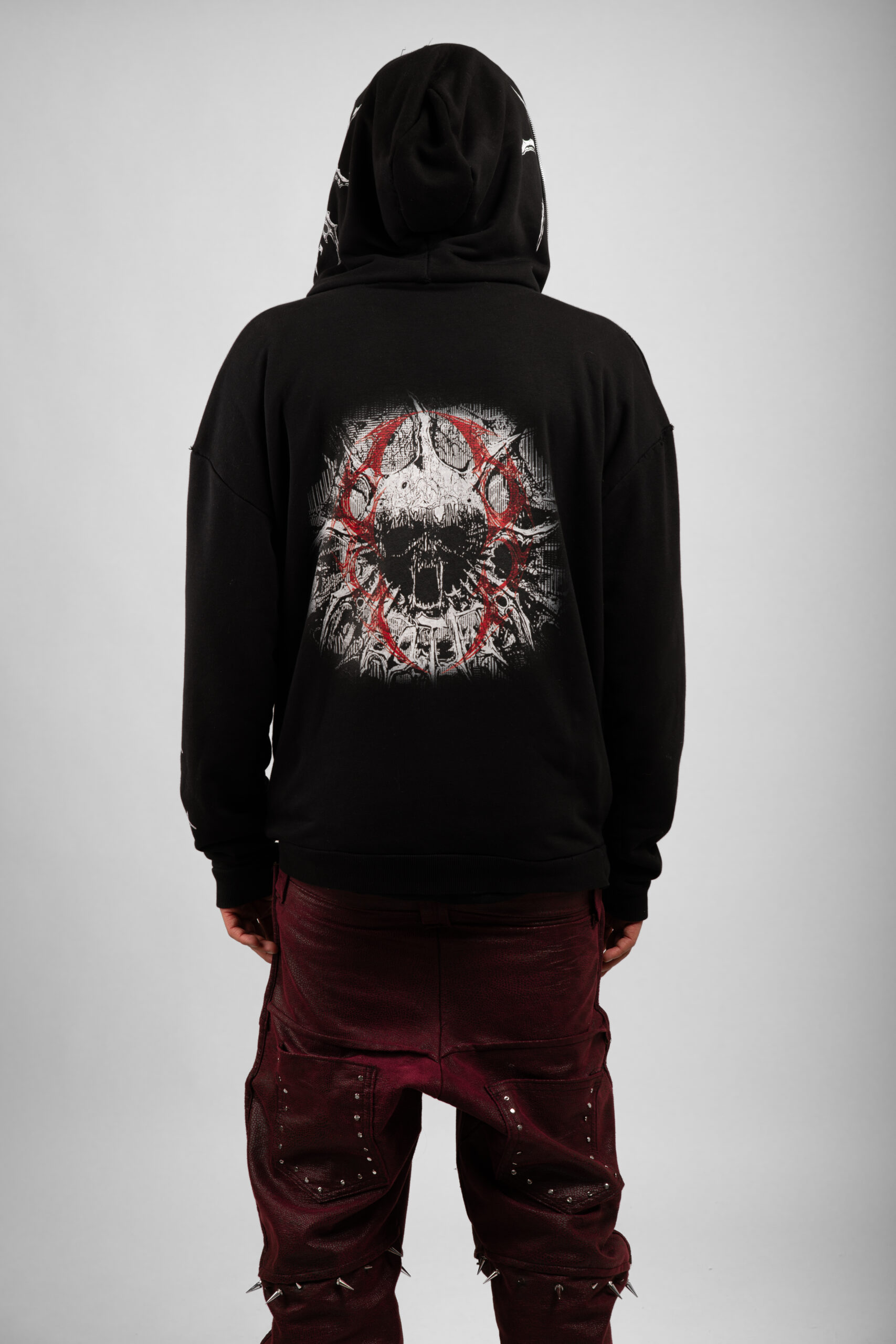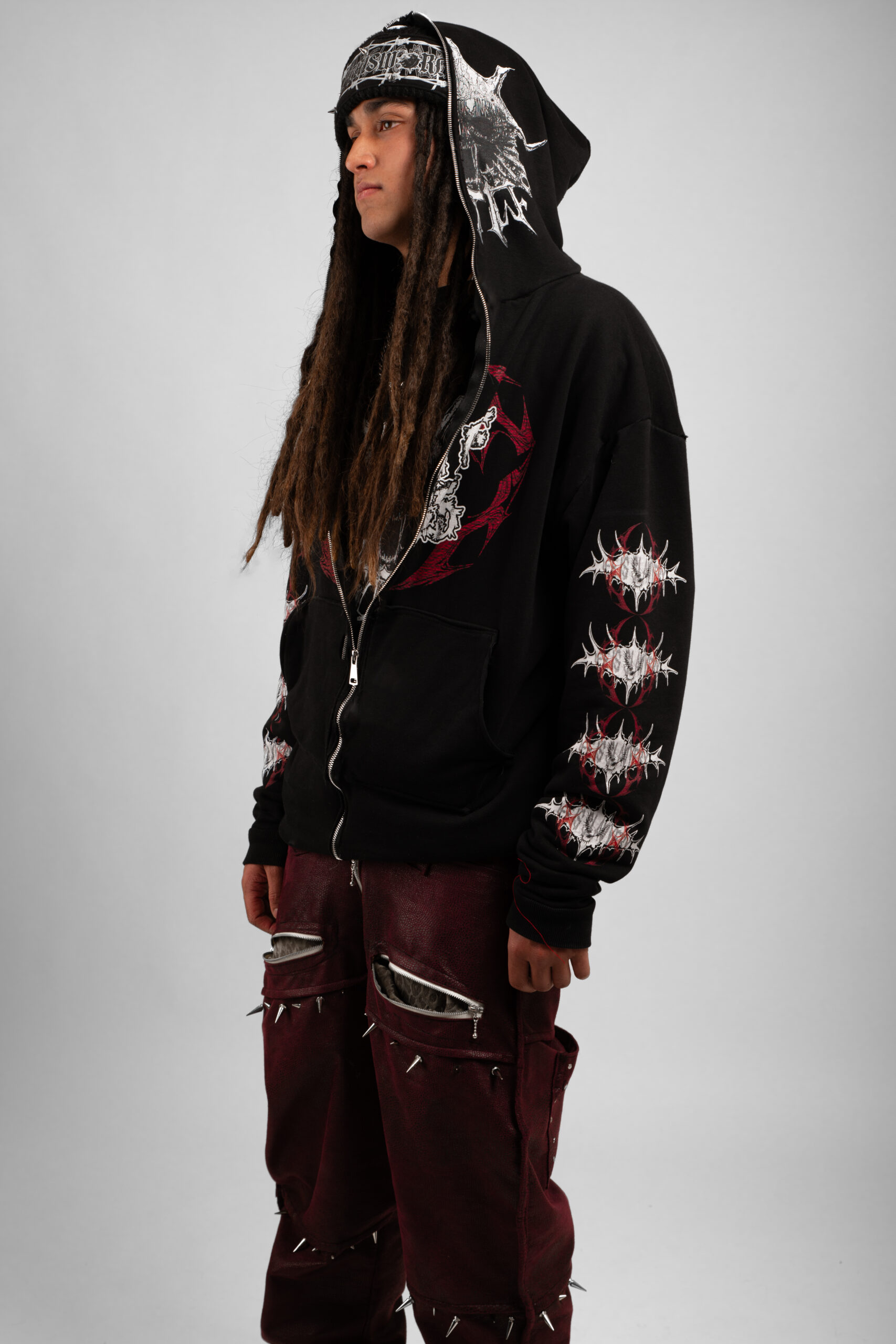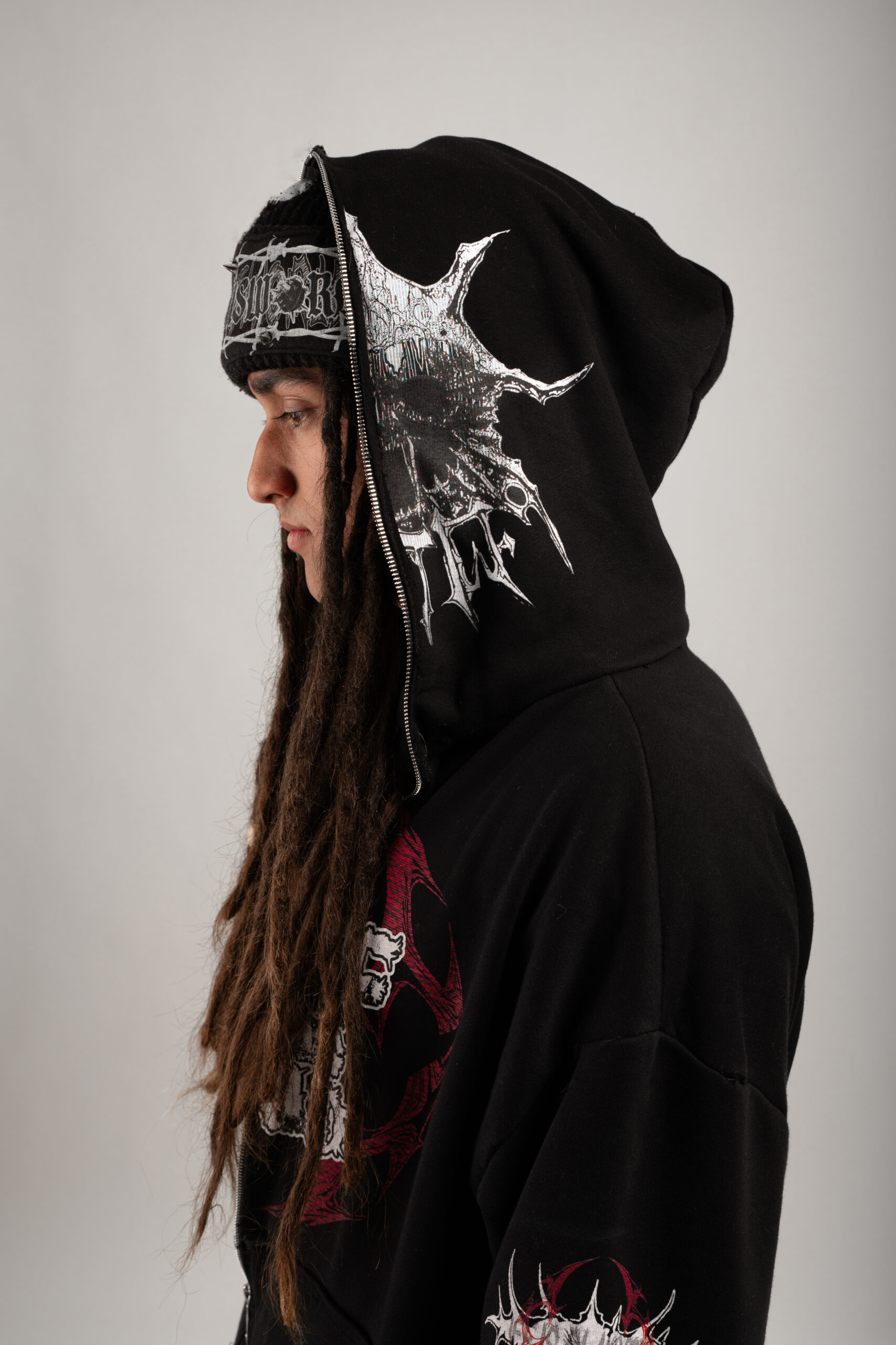 100% cotton heavyweight fullzip hoodie with print on sleeves, hood, back side, front side
